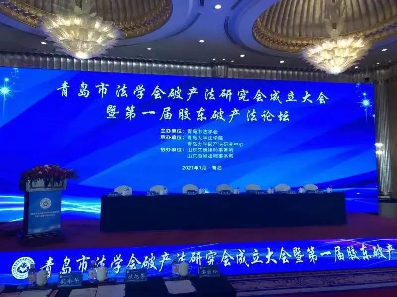 2021年1月16日,青岛市法学会破产法研究会成立大会暨第一届胶东破产法论坛在青岛成功召开。本次会议由青岛市法学会主办,青岛大学法学院和青岛大学破产法研究中心承办,山东文康律师事务所、山东海鲲律师事务所协办。会议分为开幕式、签约仪式与专题报告、学术研讨、闭幕式四个部分,来自全国各地的破产法专家、学者、法官、律师等齐聚一堂,共同参与此次大会与论坛。山东颐衡律师事务所主任、党支部书记赵纯永,山东颐衡律师事务所兼职律师、青岛大学法学院副院长马卫东,山东颐衡律师事务所专职律师于松应邀参会。