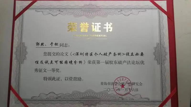 本次会议的闭幕式由青岛大学法学院副教授杨永志主持,在该环节中,他宣读优秀论文获奖名单并主持对获奖人员进行颁奖,经专家评委会认真阅读、评选,最终评出优秀论文一等奖5名、二等奖10名、三等奖18名。山东颐衡律师事务所于松律师与他人合作撰写的论文《<深圳特区个人破产条例>设立必要性及试点可能困境分析》荣获本次论坛优秀征文一等奖。