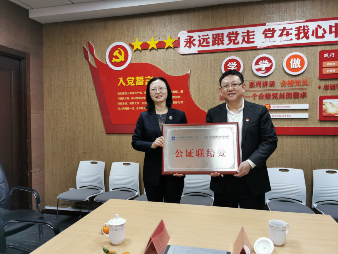 2021年1月22日,山东省青岛市市中公证处应邀在山东颐衡律师事务所设立公证联络处,并在山东颐衡律师事务所举行揭牌仪式。山东省青岛市市中公证处主任冷春、沈洁英工作室负责人沈洁英、金融公证服务中心副主任岳鹏,青岛权信纵拓知识产权代理有限公司总经理宋建民,青岛大学法学院副院长马卫东,山东颐衡律师事务所党支部书记、主任赵纯永、执行主任戚威、知识产权部长宋宗金参加了揭牌仪式。