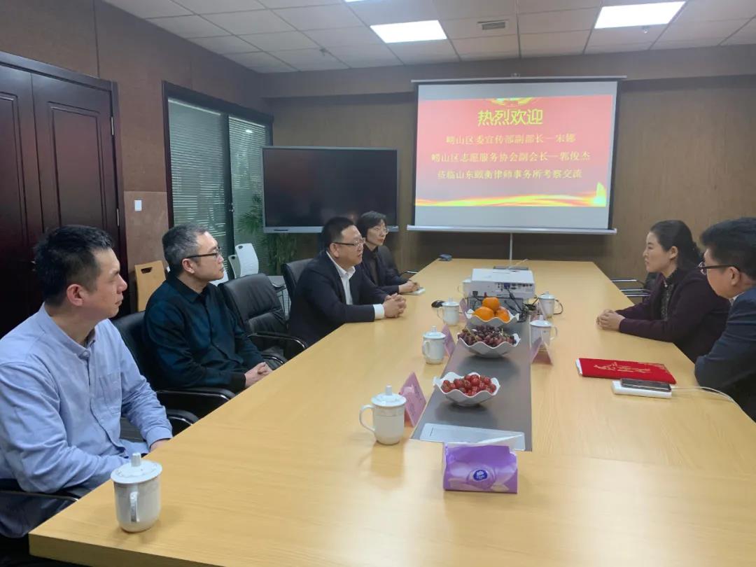 2021年3月23日下午,崂山区区委宣传部副部长宋娜、崂山区志愿服务协会副会长郭俊杰到颐衡所考察交流志愿者相关情况,律所赵纯永主任对宋娜副部长一行的到来表示了热烈的欢迎,并介绍了律所的团队建设、管理模式、执业理念、业务范围以及坚守的“三驾马车,并驾齐驱”的发展原则。宋娜副部长表示,志愿者协会和律师协会有很多共通之处,作为社会团体都承担着重要的社会和法律责任,律所和志愿者服务要加强交流,形成社会发展的合力,不断为公益事业做出更大贡献。