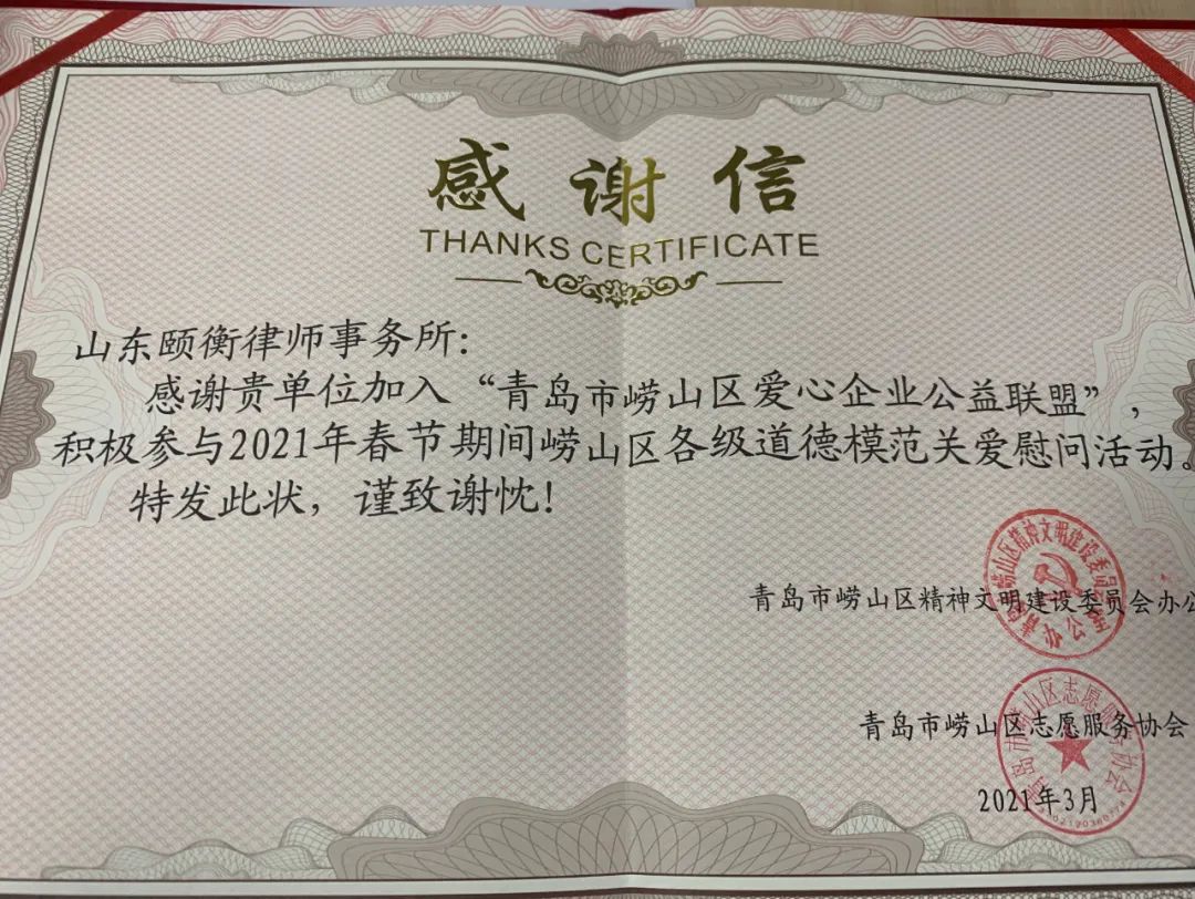 志愿者服务协会感谢山东颐衡律师事务所在志愿服务中的贡献,并为律所颁发了感谢信,感谢颐衡所在志愿服务中发挥的积极作用,并鼓励颐衡所不断发挥律所在传播法律,助力公益方面的积极作用,积极普法,把法律渗透到公民生活的每一个角落。