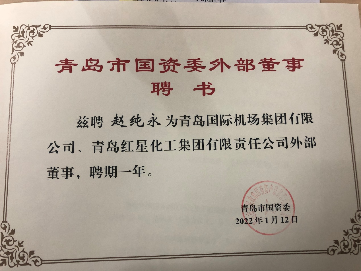 近日,为加快推行外部董事制度,加强市属企业董事会建设,完善企业法人治理结构,青岛市国资委经过前期人选报名、资格审查、专家评审、背景调查等程序,经过层层筛选,山东颐衡律师事务所党支部书记、主任赵纯永担任青岛国际机场集团有限公司、青岛红星化工集团有限责任公司两家公司的外部董事。