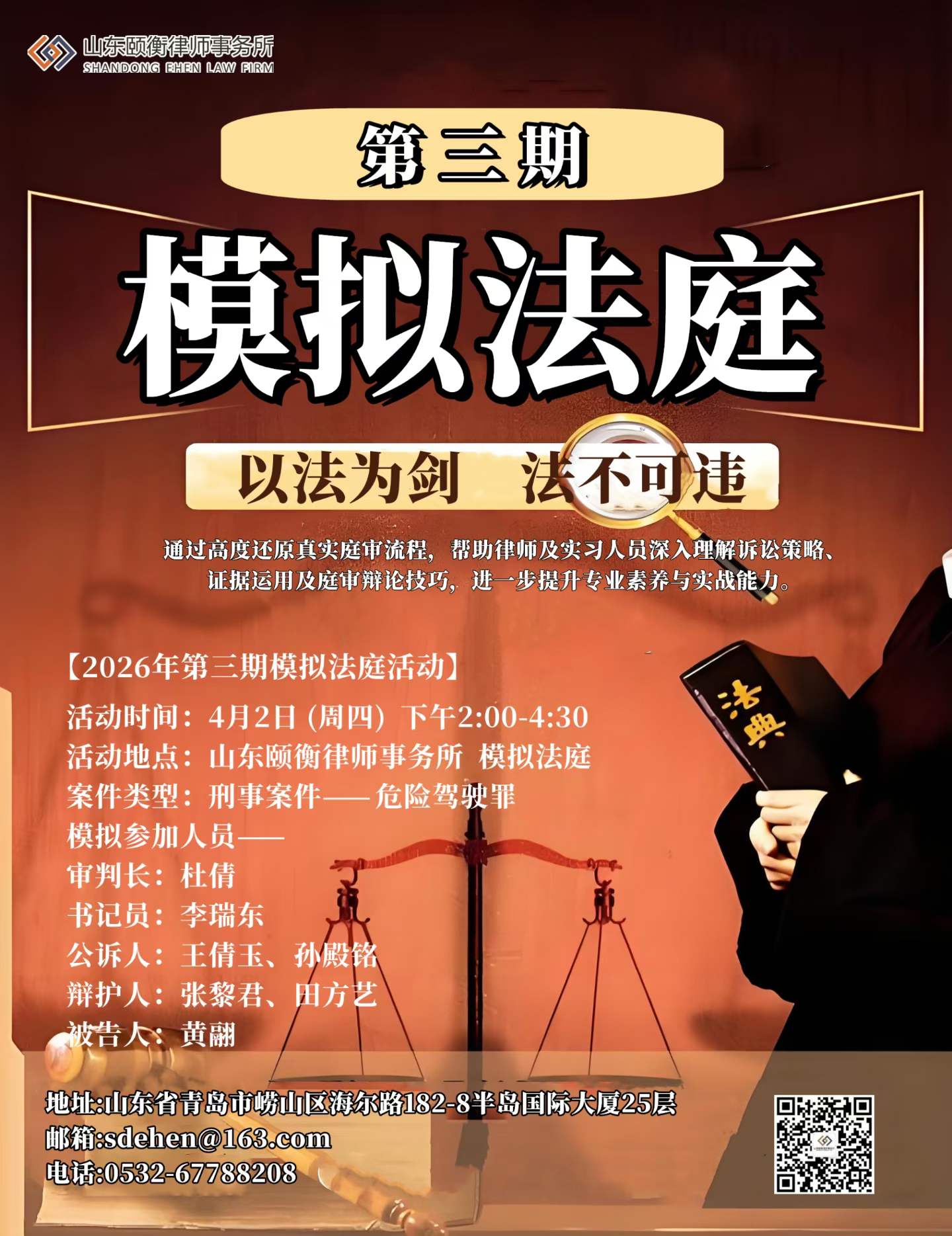 4月2日下午,山东颐衡律师事务所第三期模拟法庭活动在律所模拟法庭内如期举行。本次活动以“以法为剑,法不可违”为主题,围绕一起真实改编的危险驾驶罪案件展开,呈现了一场高度还原、精彩纷呈的庭审对抗。