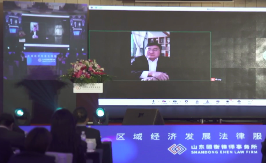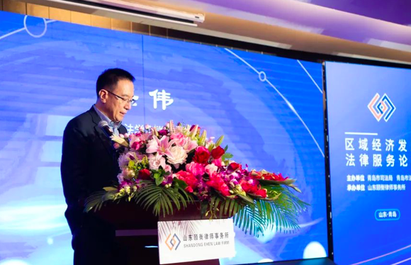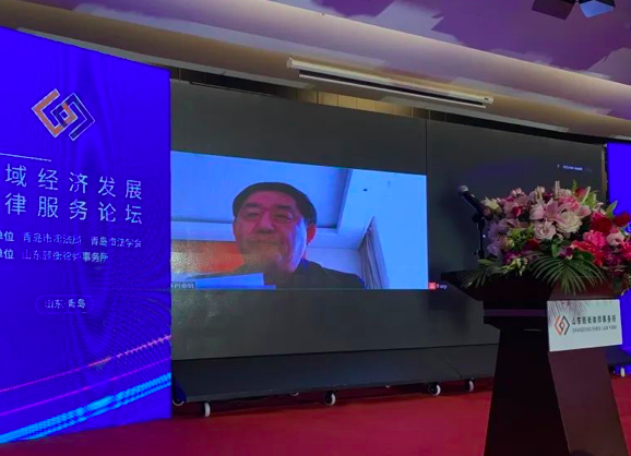 青岛市司法局党委书记、局长万振东先生由于公务繁忙,无法亲自到场,他通过视频连线的方式向本次论坛的举办表示祝贺,并表示法律人士要在服务区域经济高质量发展上更加主动作为,积极研究探讨法律与工业互联网、信息技术、数字经济等新兴产业的深入融合等热点问题;针对区域经济发展中地方政府和企业越来越多的法律服务需求,我们要搭建政企桥梁,加强与政府相关部门的联系,为加快营商法治环境建设添砖加瓦,为政府部门依法履职提供更好的法律服务和保障;我们要主动搭建企业合作交流平台,主动回应和深入了解企业发展的法律服务需求,积极维护企业的合法权益;我们要主动思考进出口贸易、电商金融、港口海洋等重点产业中的法律应用问题,以便更好地服务市场经济,为外商来胶东地区投资提供有力的法律保障。
