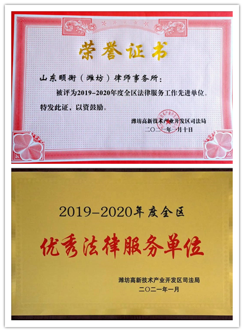 2021年1月10日,潍坊高新技术产业开发区司法局印发潍高司发【2021】1号文件《关于表彰2019-2020年度全区法律服务行业先进单位和先进个人的决定》,对全区法律服务行业先进单位和先进个人进行表彰。山东颐衡(潍坊)律师事务所被授予2019-2020年度全区法律服务工作先进单位,山东颐衡(潍坊)律师事务所主任张安军、副主任张蕾被授予2019-2020年度全区法律服务工作先进个人。