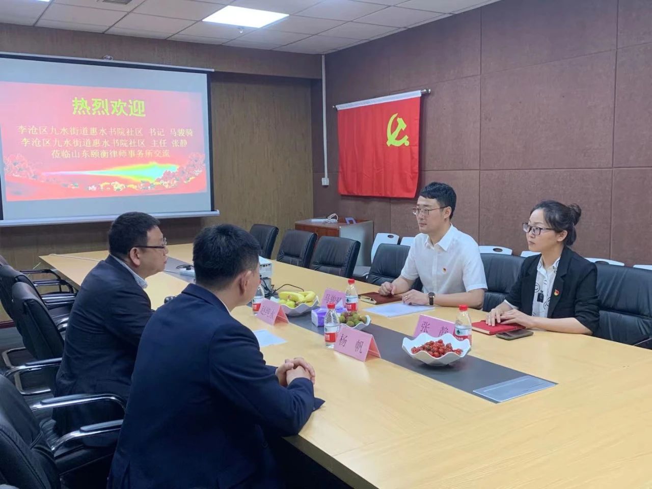山东颐衡律师事务所党支部书记、主任赵纯永,律师代表杨帆,李沧区九水街道惠水书院社区书记马骏骑,主任张静出席活动。