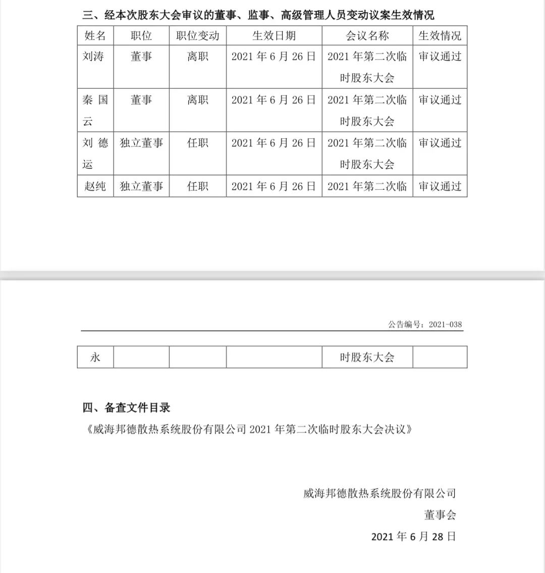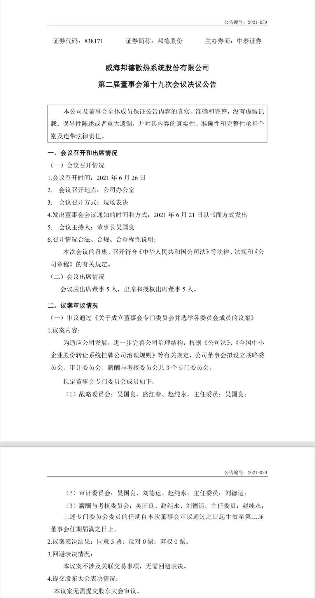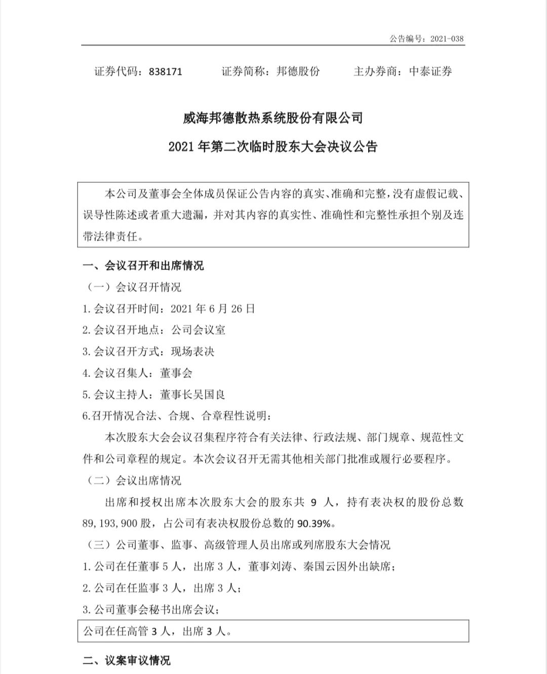 2021年 6 月 26日,山东颐衡律师事务所党支部书记、主任赵纯永参与了威海邦德散热系统股份有限公司2021年第二次临时股东大会,并当选为该公司独立董事。同时,赵纯永主任在威海邦德散热系统股份有限公司第二届董事会第十九次会议上,经表决通过,当选为董事会薪酬与考核委员会主任委员、战略委员会委员、审计委员会委员。