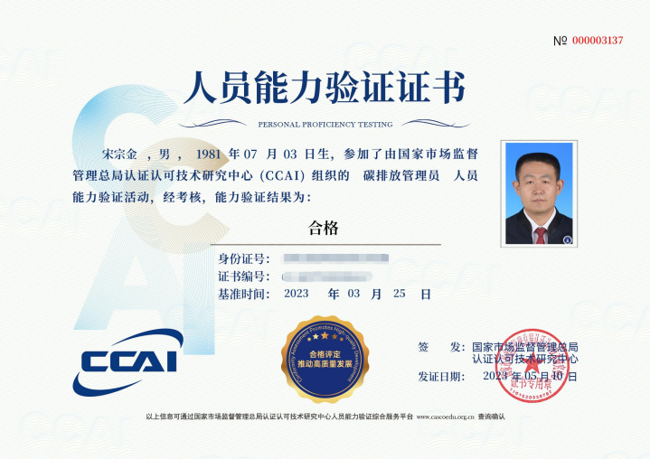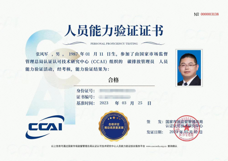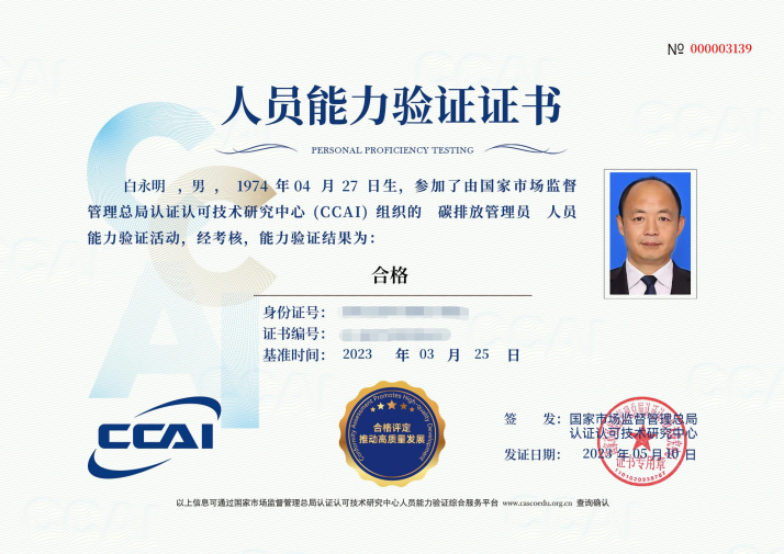 山东颐衡律师事务所环境资源与能源法律事务部负责人白永明律师、合伙人宋宗金律师及张风军律师参加了由国家市场监督管理总局认证认可技术研究中心(CCAI)组织的“碳排放管理员”人员能力验证活动,经考核均验证合格,三位律师取得“碳排放管理员”职业资格并获得国家市场监督管理总局认证认可技术研究中心颁发的证书。