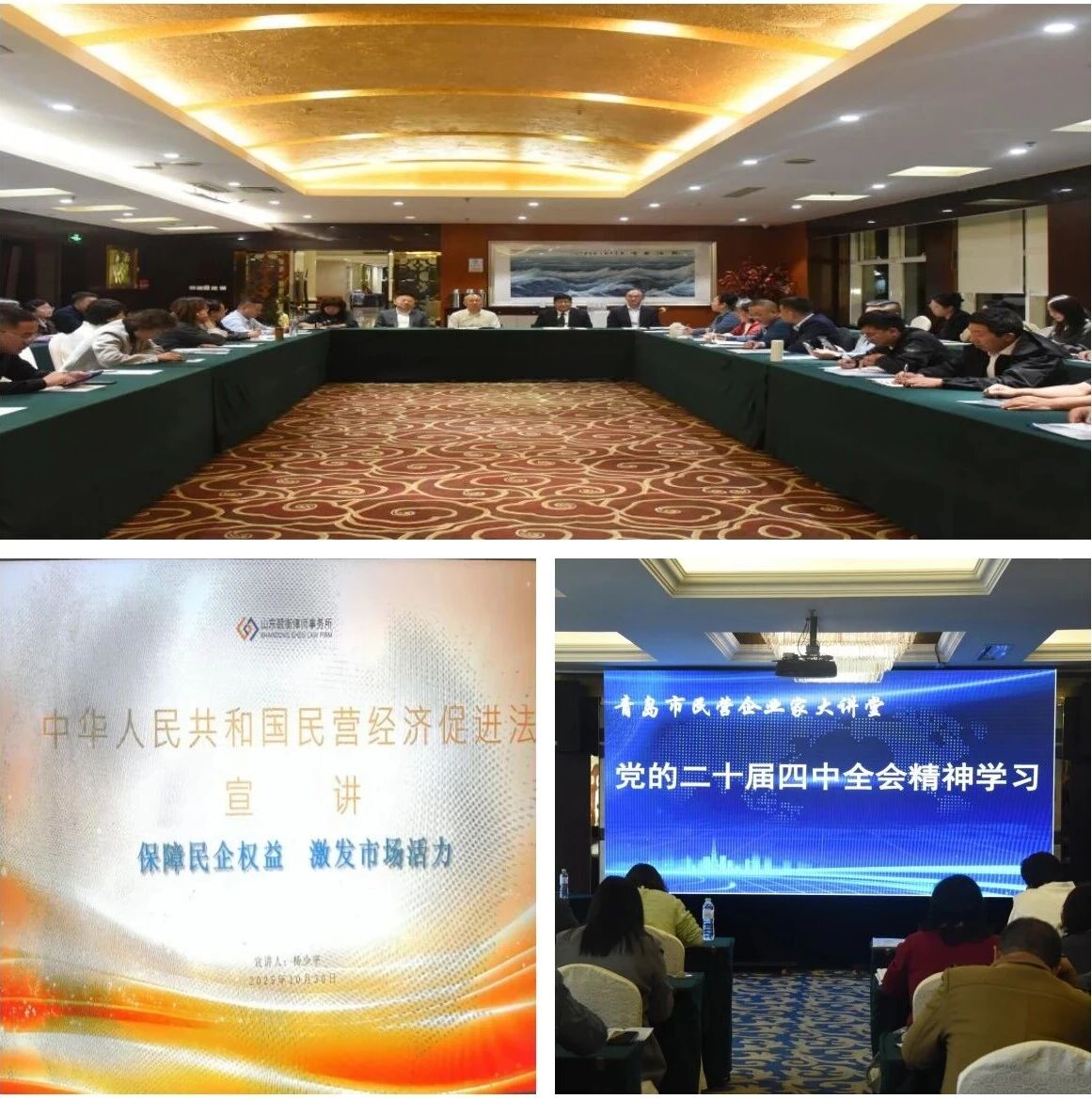 《民营经济促进法》颁布以来,杨少平律师始终以“政策传递者、企业护航者”的双重身份积极履职。作为青岛市工商联首期聘任并续聘至今的商会首席政策官,他先后三次参与高规格专项培训:2025年5月19日,作为十名商协会代表之一,杨律师赴青岛市政府参加了《民营经济促进法》的全国宣讲启动仪式视频会,该宣讲会由国家发改委的领导深度解读;5月26日,参加由崂山区政府主导组织的《民营经济促进法》宣讲,并由中国民营经济研究会原会长庄聪生进一步讲解《民营经济促进法》;6月12日,在青岛市政府市级机关会议中心,由国家发改委民营经济局副局长刘鑫亲自线下再次专题解读《民营经济促进法》,并公布了由高校教授、资深仲裁员及资深律师等32名专家组成的首批《民营经济促进法》志愿宣讲团成员名单,杨律师有幸受聘为首批宣讲团成员之一。在《民营经济促进法》的宣讲方面,5月29日,山东省河北商会举行“护航企业发展”会员日活动,杨律师应邀参加并就新出台的《民营经济促进法》进行解读;6月25日,在青岛仲裁委员会举办的“仲裁开放日”活动中,杨律师为参加活动的三十多家民营企业解读《民营经济促进法》;11月15日,山东省律师协会民事法律专业委员会举行第二次全体会议,民委会副主任杨少平律师受邀宣讲《民营经济促进法》并组织研讨交流。