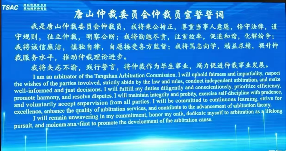 会议举行了隆重的仲裁员宣誓仪式。新一届仲裁员在仲裁员代表许俊楠带领下庄严宣誓,宣誓声铿锵有力,彰显了仲裁队伍对维护公平公正、恪守职业道德的坚定信念与责任担当,更是对社会各界的公开承诺。会议还正式发布了新版唐仲《章程》《委员会工作守则》、2026版《仲裁规则》以及《民主议事管理办法》《信息公开管理办法》《投诉处理管理办法》等制度。