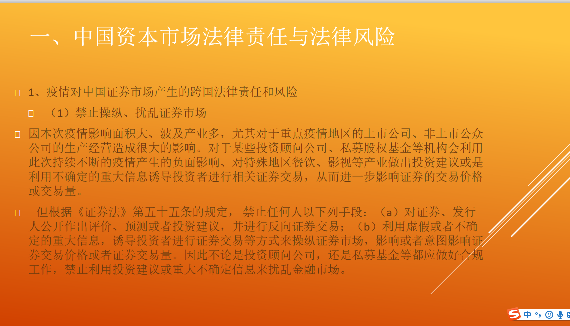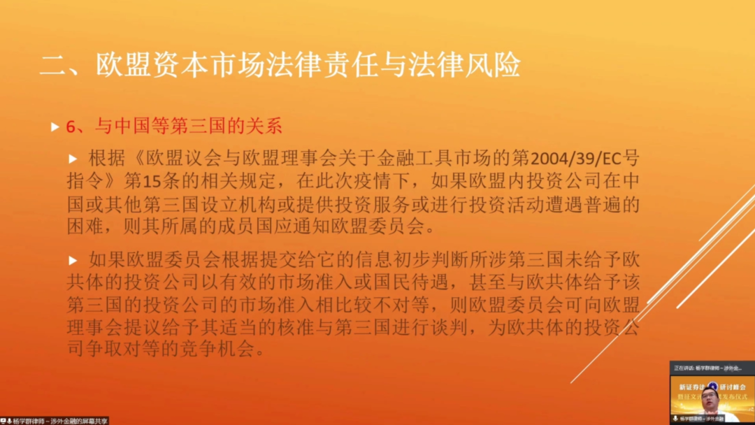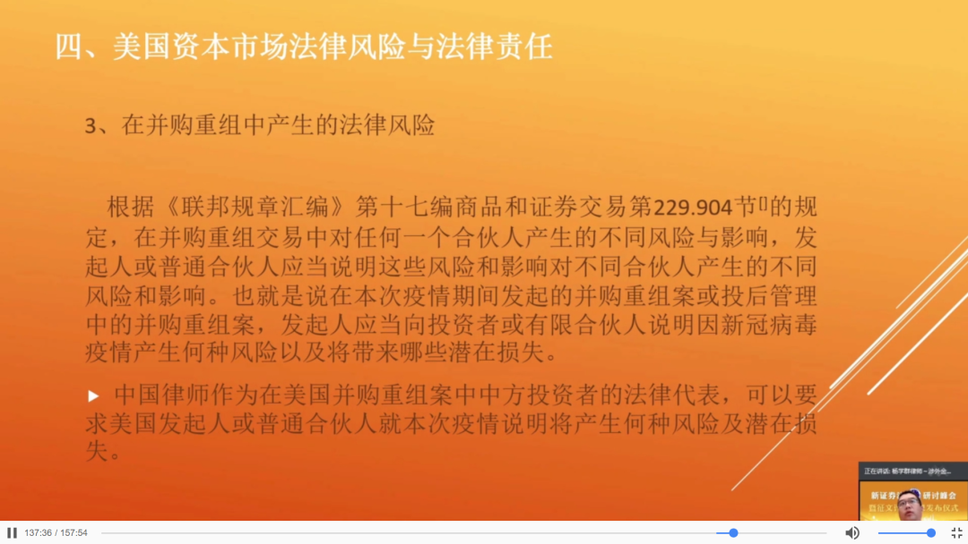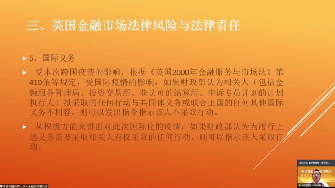 杨学群律师就《新冠病毒疫情对国际资本市场法律风险与责任的思考》专题论文向大会做汇报。